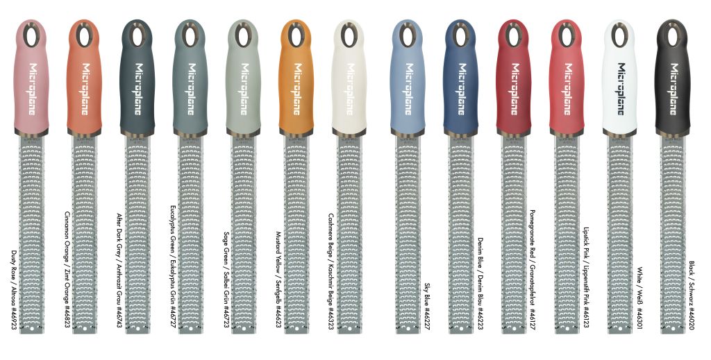 Die Serie umfasst vier verschiedene Reiben: die Zester/Reibe, eine Reibe mit mittelgroßer Schneide, eine sehr grobe Reibe und eine Gewürzreibe.
